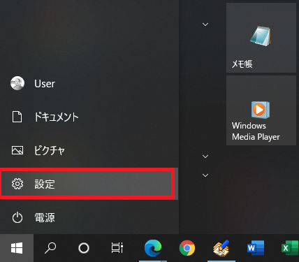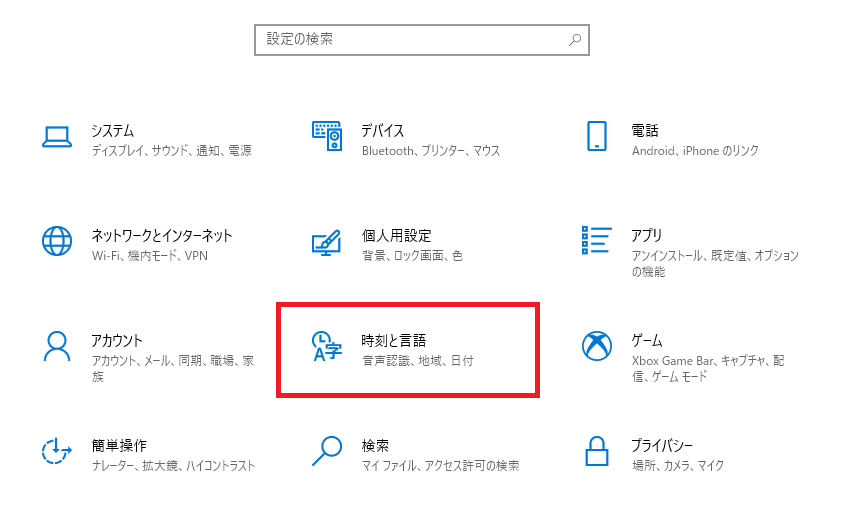 「スタート」→「設定」→「時刻と言語」を開きます。