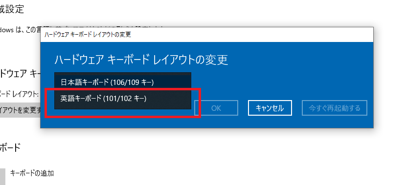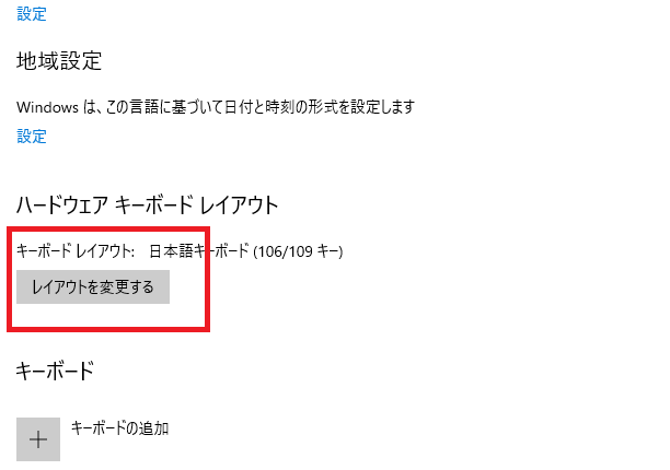 設定は「時刻と言語」ではなく「言語と地域」から進み、 その中にある「ハードウェアキーボードレイアウト」で、 日本語キーボード(106/109キー)と英語キーボード(101/102キー)を選び直します。